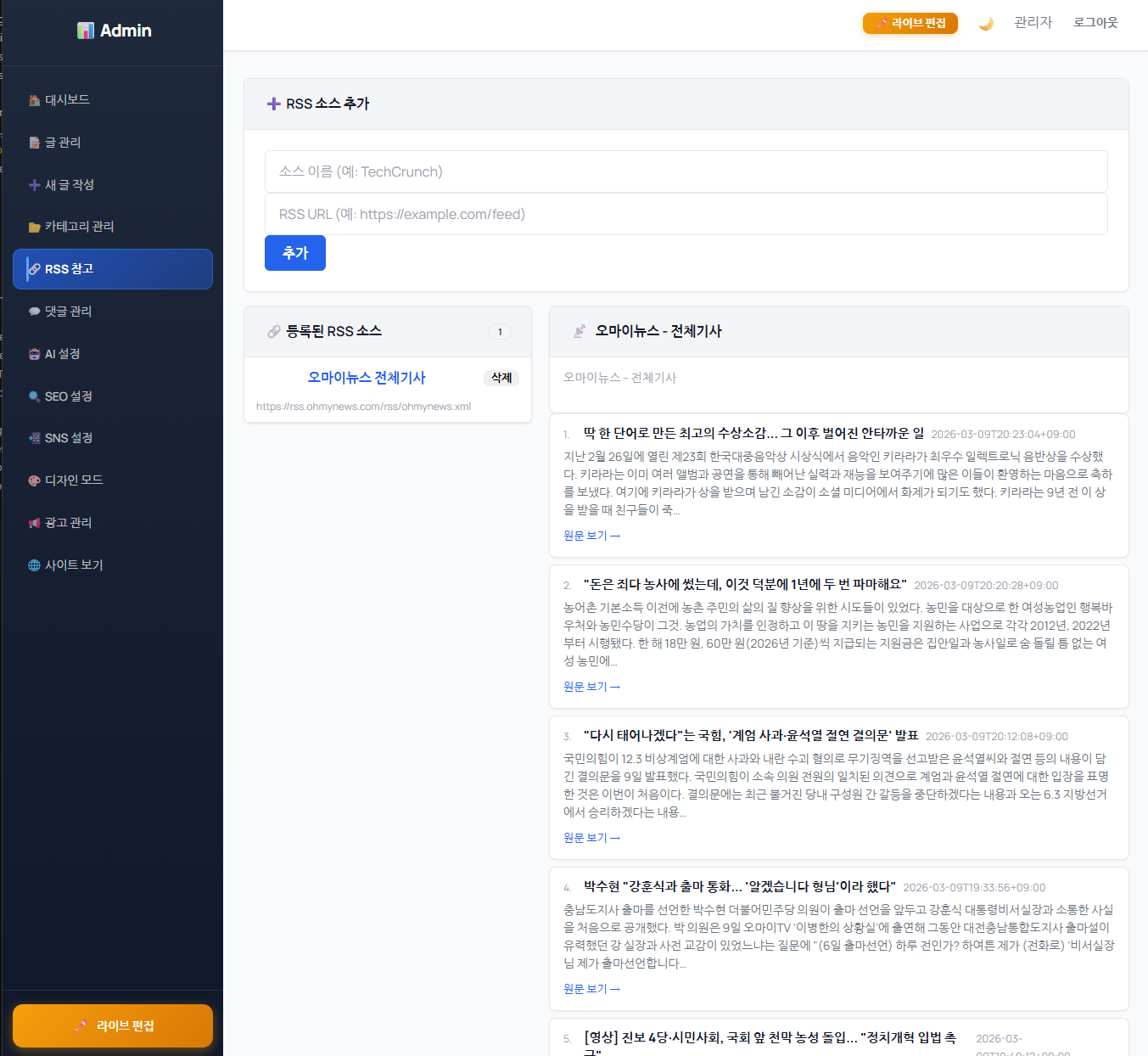 sitemap · OG 태그 · robots.txt · slug 퍼머링크 자동 처리.