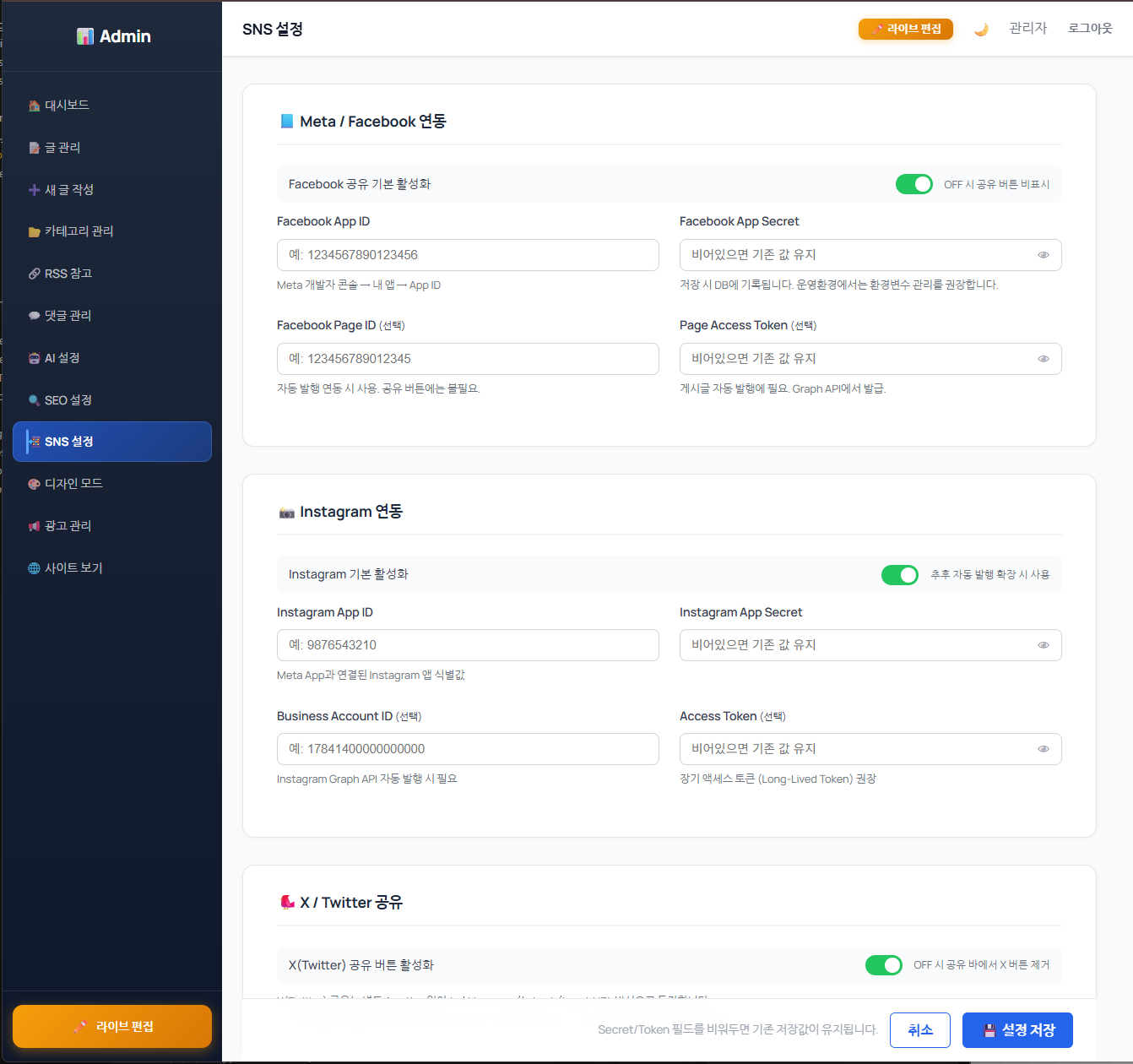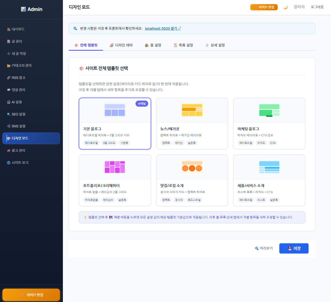 디자인 설정 화면에서 블로그 색상 테마, 폰트, 다크모드 여부 등 시각적 요소를 관리자가 직접 설정해 브랜드에 맞는 블로그 외관을 구성할 수 있습니다.