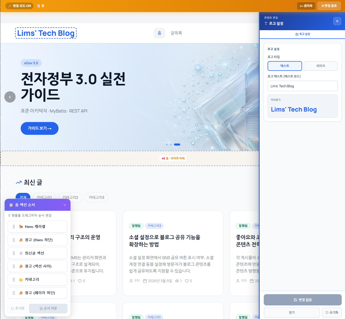 개발자 없이도 홈페이지 레이아웃을 바꾸고, 폰트·색상·섹션 순서를 실시간으로 편집할 수 있는 디자인편집모드를 상세히 소개합니다.
