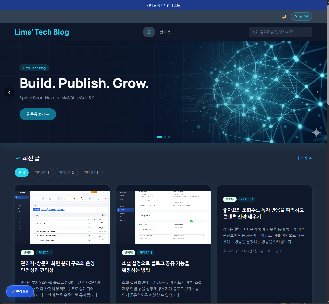 전자정부3.0 스타일 블로그 CMS는 관리자 화면과 방문자 화면이 완전히 분리된 구조로 설계되어, 콘텐츠 관리와 보안이 높은 수준으로 유지됩니다.